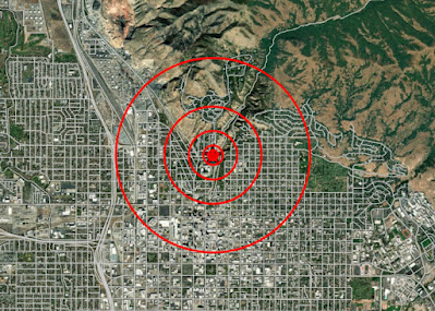 | Modern aerial image of Salt Lake City. Rings show the distance from the blast central point at 100, 200, 500, 1000, and 2000 meters. At the 2000 meter mark (outermost ring), 1870s buildings would have minor damage, primarily broken windows. |